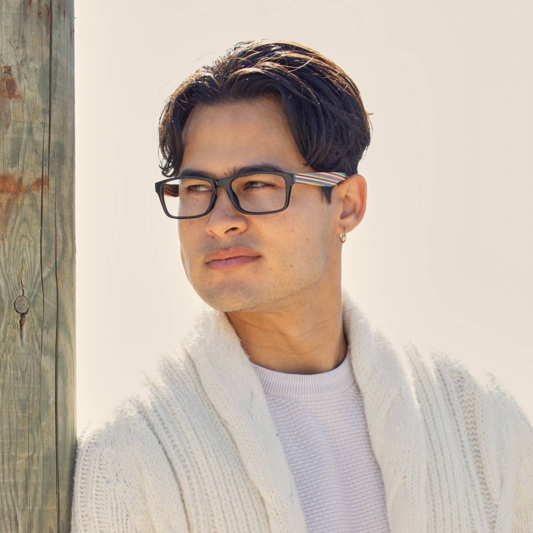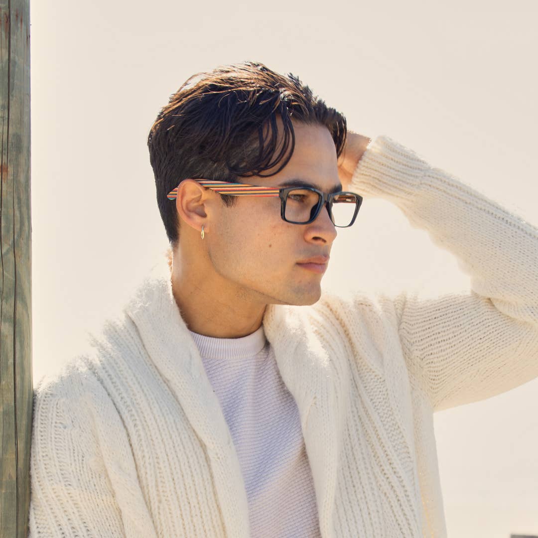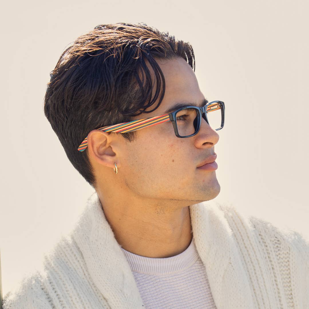 The Aloha Rainbow Wood Blue Light Reader is our slimmed down square shape. A perfect look for men and women alike, now featuring a blue light filtering lens.