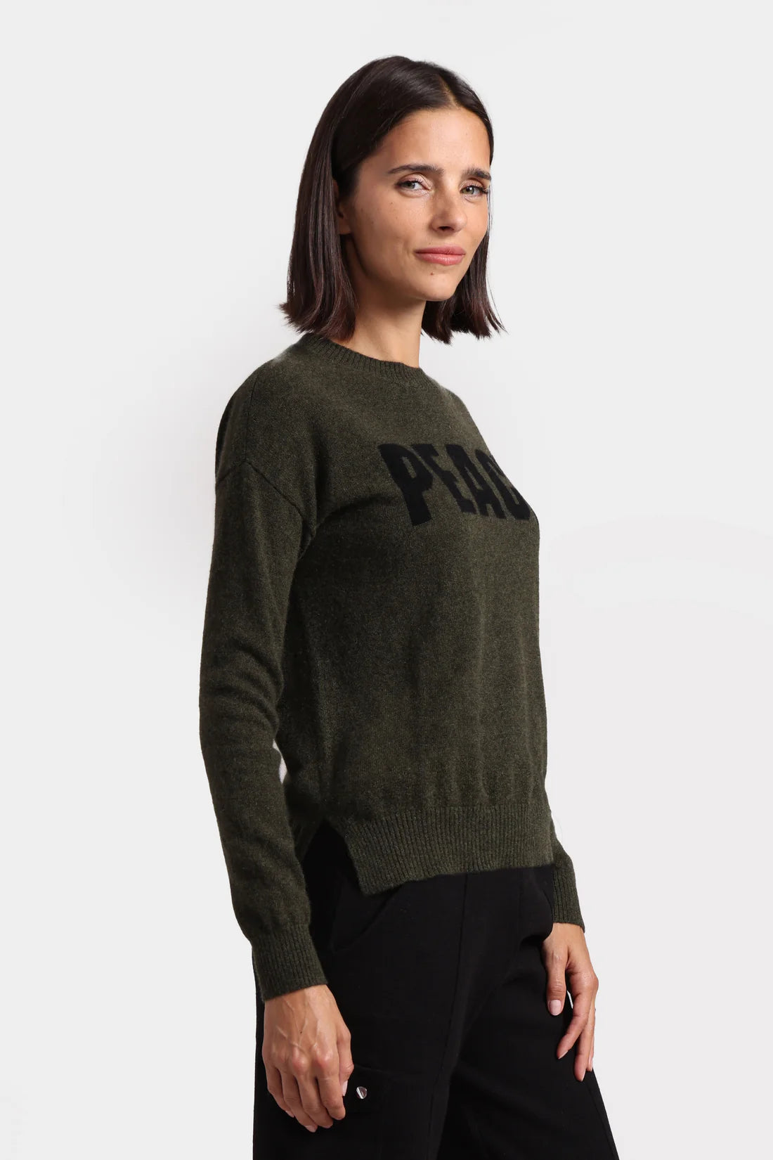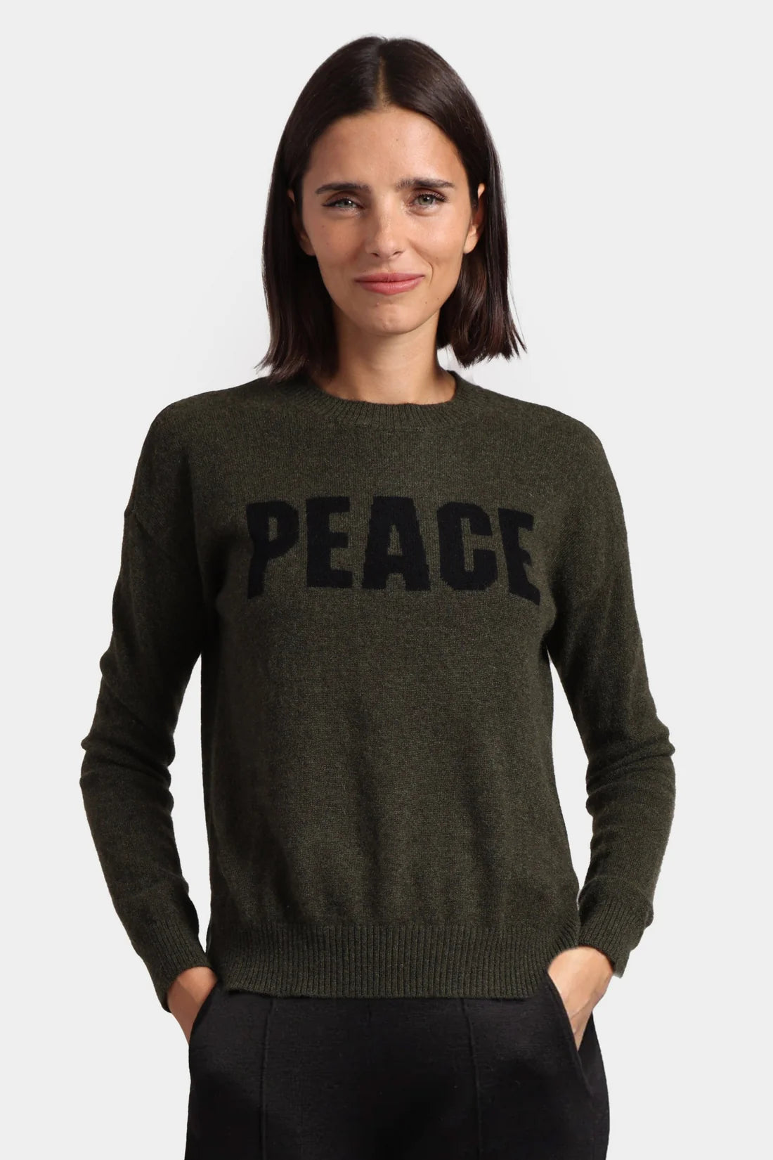 Experience ultimate coziness and style while promoting PEACE! Made from the softest cashmere, this sweater keeps you chic, comfortable and PEACEFUL. The classic crew neck design features the word PEACE in knit intarsia adding this wonderful message to this timeless silhouette