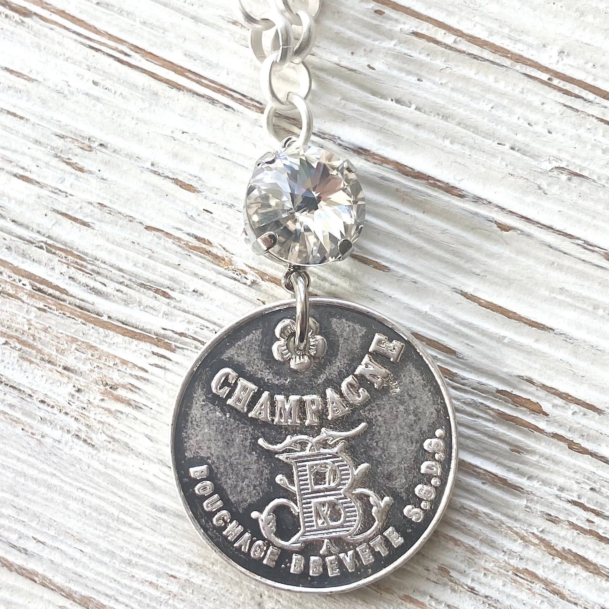 Champagne? Oui s’il vous plait❤️ These French coin necklaces are so cute and trending right now. Adjustable up to 20” 12mm sparkle clear Swarovski connector. Choose your color(s)