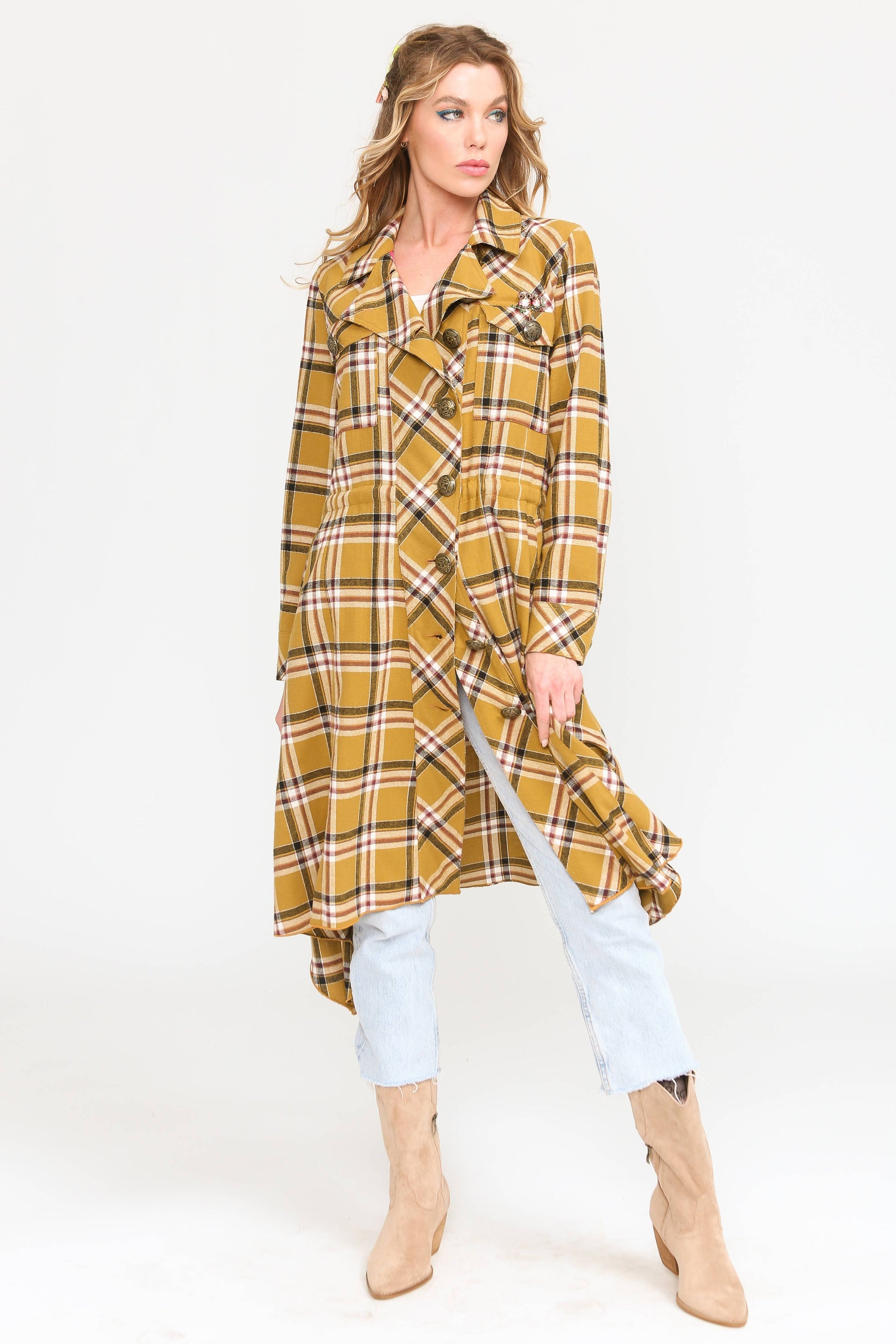 * Plaid button-down asymmetrical hem trench coat with owl pin attached to the front