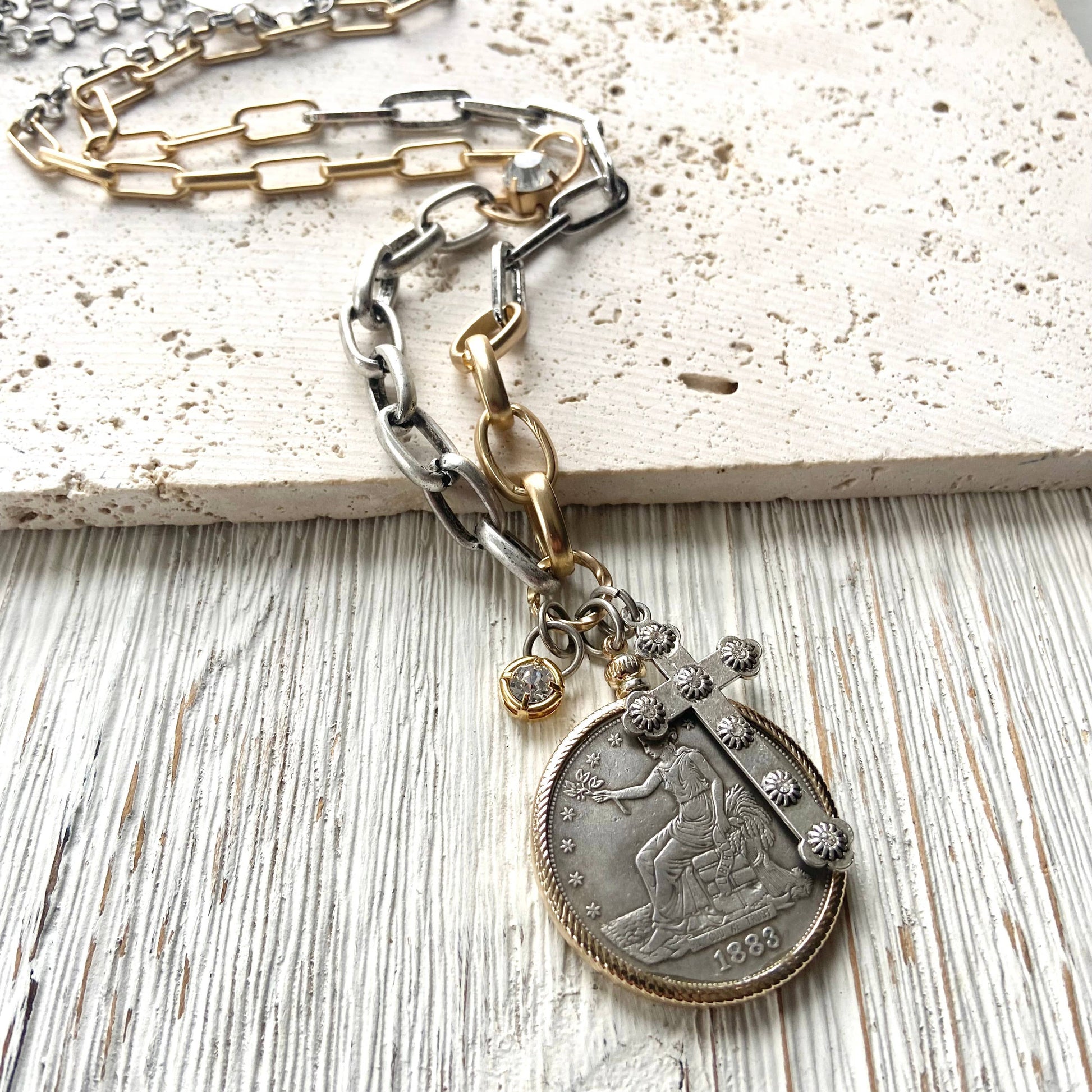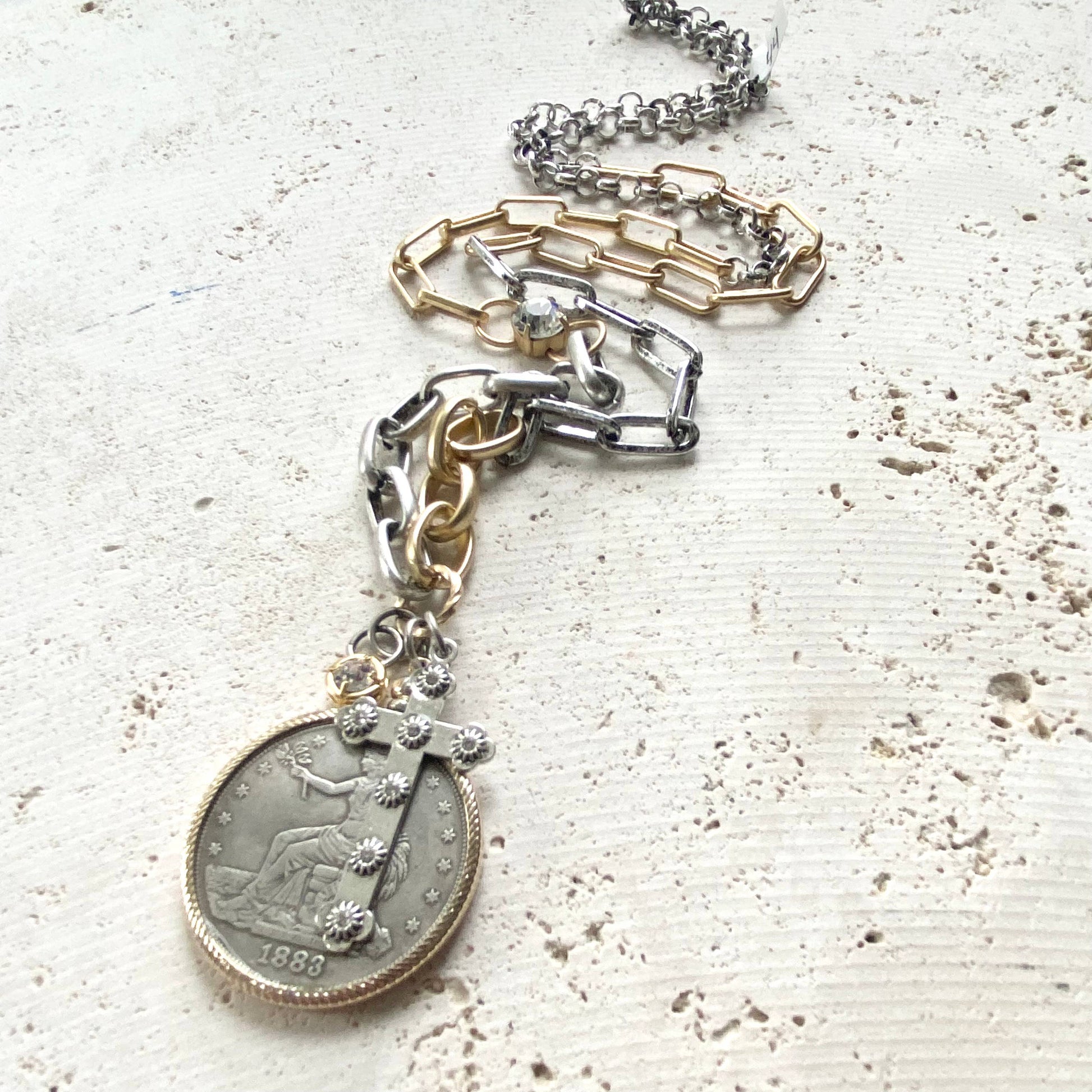 This necklace features an American replica detailed coin clustered with a silver sparkly cross and crystal charm. The mixed metals give this necklace a vintage eclectic vibe. 32”