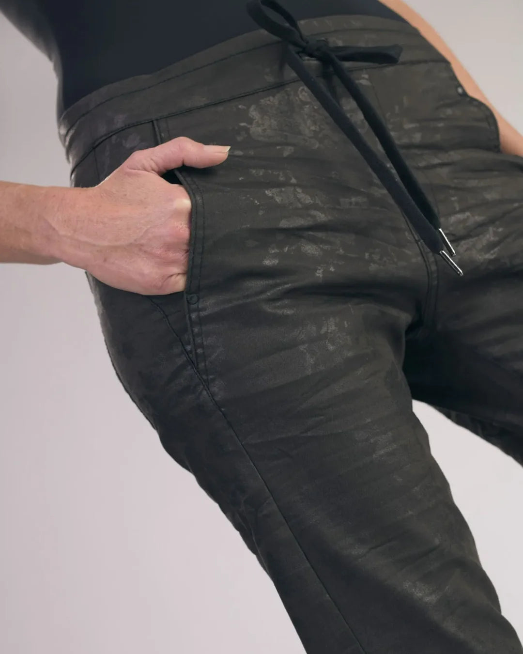 Our must-have cult favorite, rendered in an abstract floral on ultra-soft stretch cotton for comfort and a great fit. The flattering mid-rise waist and a more relaxed taper than standard-issue skinny jeans makes our beloved Iconic Stretch Jeans deliciously comfy���never skin-tight. And, an adjustable drawstring waist provides extra breathing room when you need it. Detailed with gentle creasing, mock fly, angled side pockets, yoked back with patch pockets, and rivet trim.
