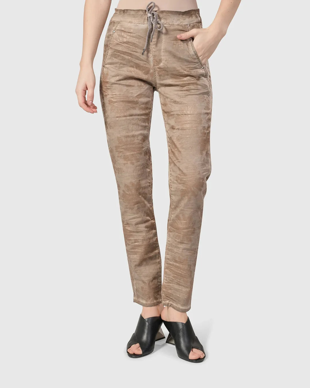 Our cult favorite, reimagined in a subtle shimmer floral on softly washed stretch cotton for an amazing fit! Enjoy a flattering mid-rise waist and a more relaxed taper than skinny jeans. Drawstring stretch waist, mock fly detail, angled side pockets, yoked back with patch pockets, and rivet trim. Voted best jeans for women over 50!