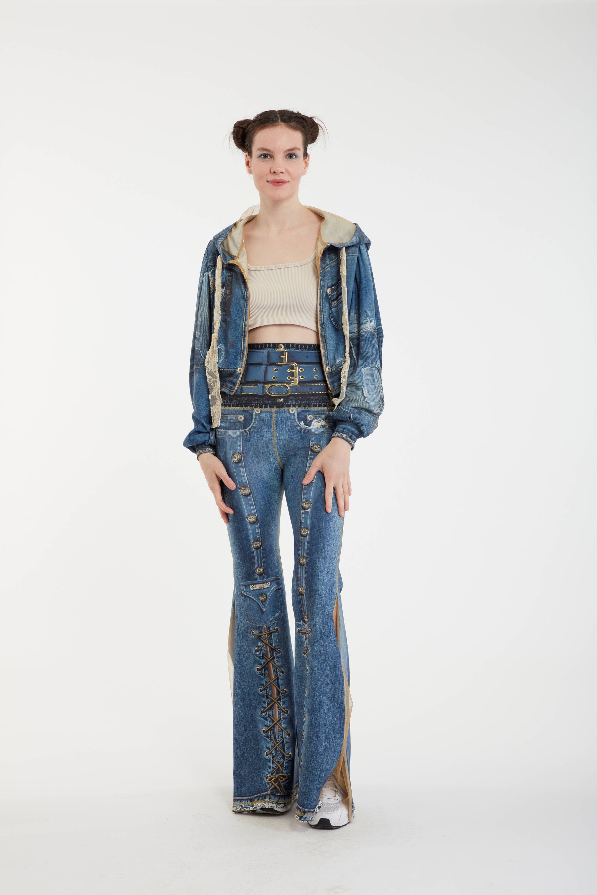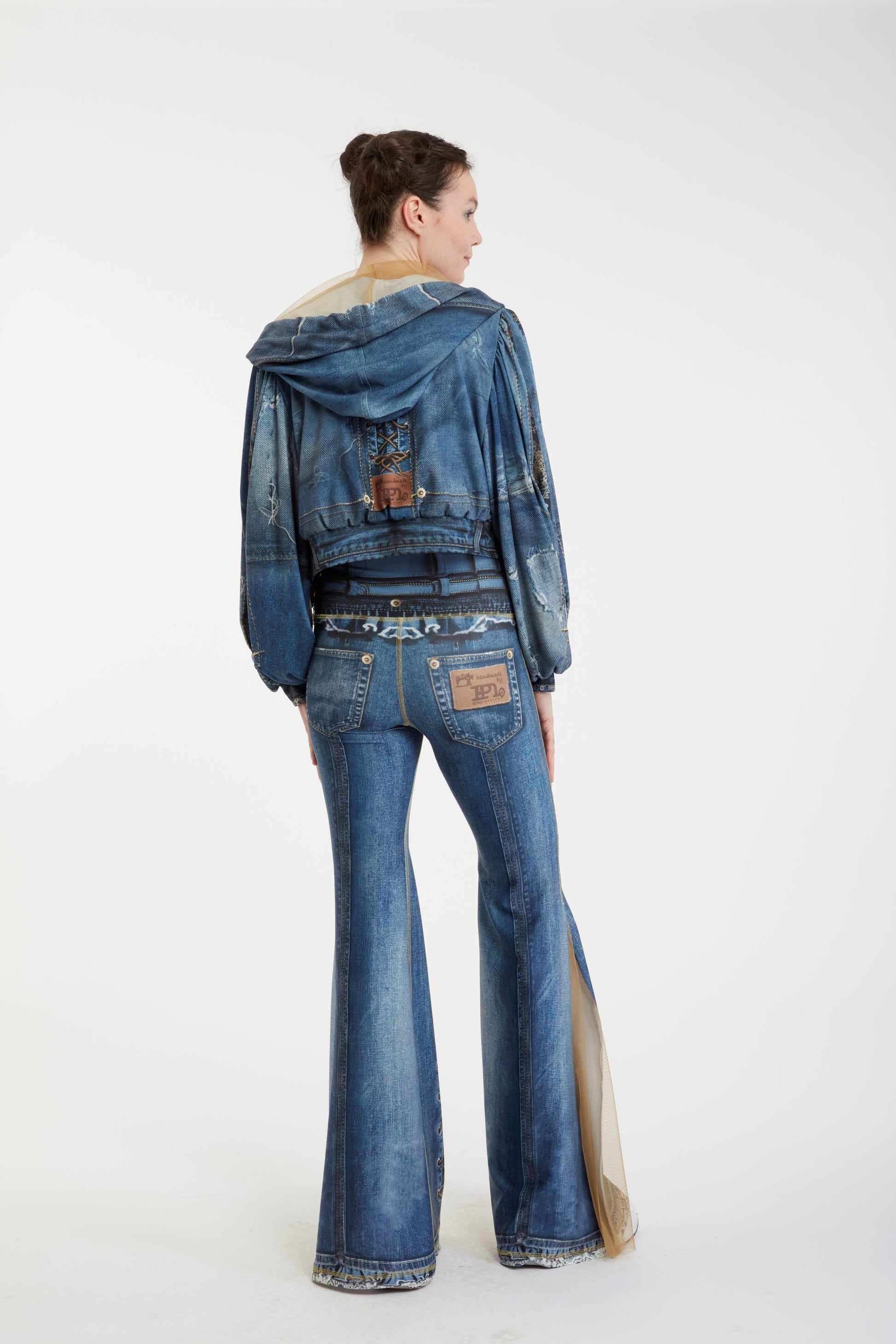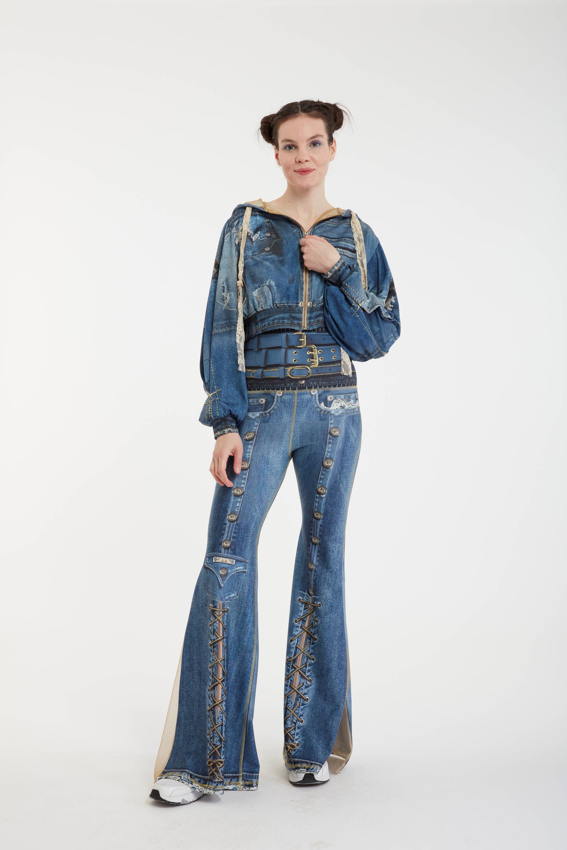 Ditch the ordinary and elevate your everyday style with this denim-looking print comfort Hoodie. This comfort hoodie with flared arms hits your waist, but also can be special ordered up to 4-inches longer (+ $7.00). Add a touch of sophistication and uniqueness to your wardrobe, whether you're out and about, working from home, or enjoying a cozy evening in.