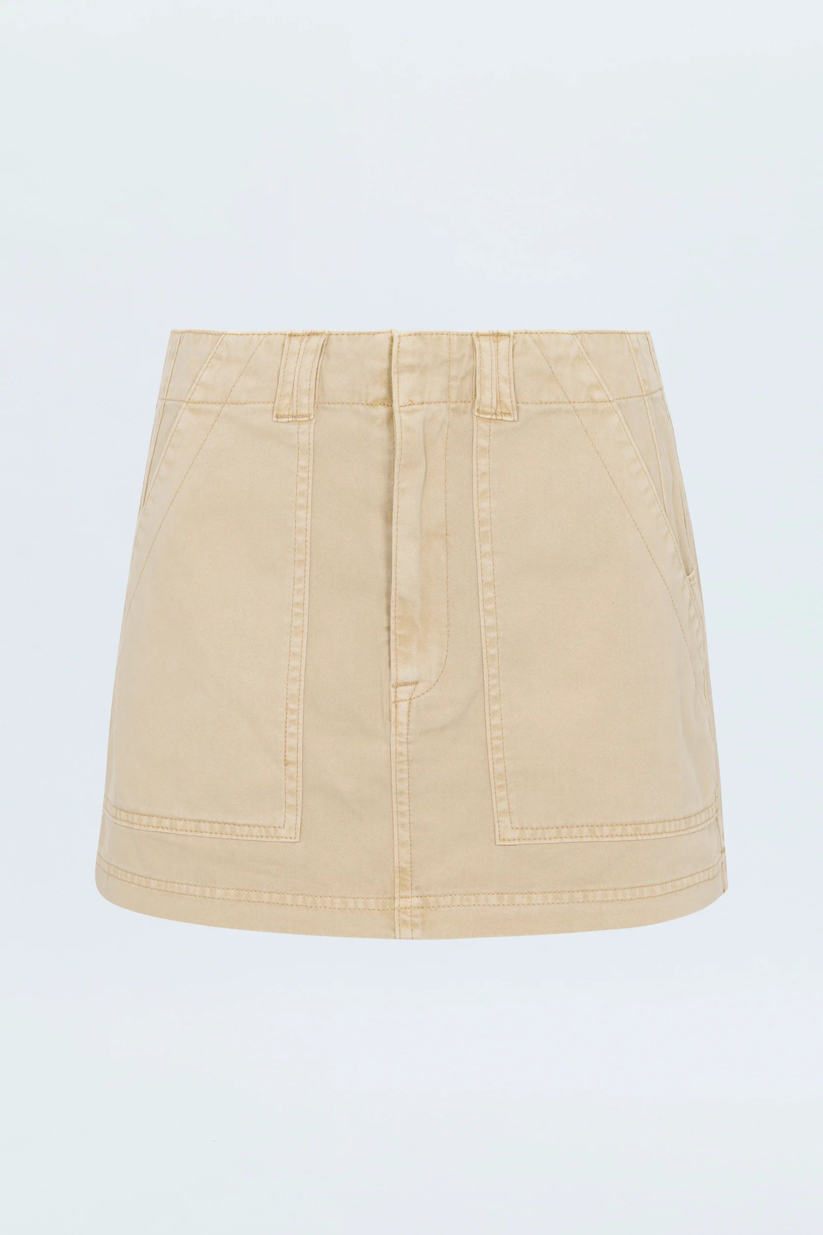 Cut in a soft lightweight rigid twill and dyed to a washed khaki the Kayla mid rise skirt boasts modern utility detailing and clean front fastening.