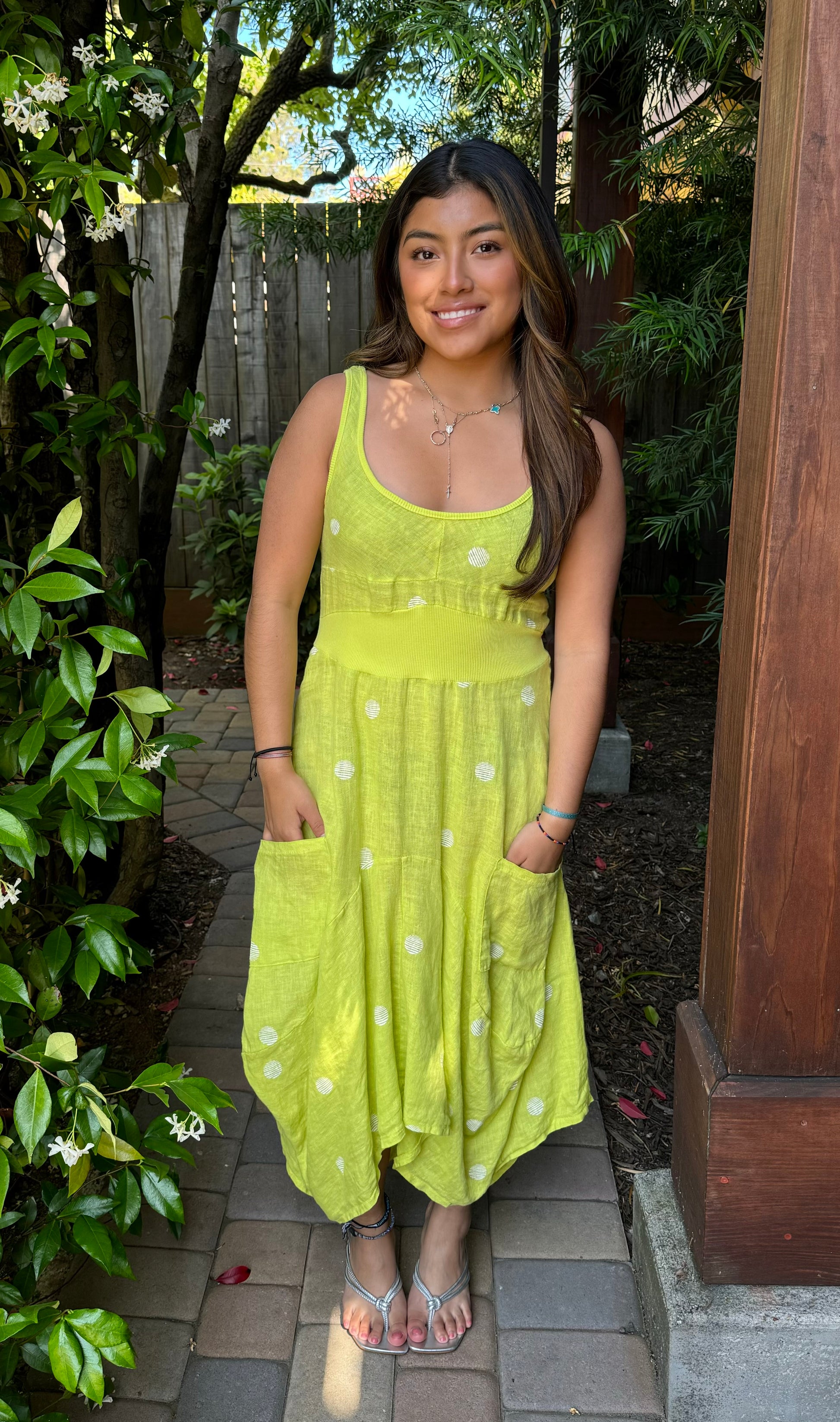 Inizio’s Linen Magic Dress flaunts a great style from Italian linen dressmaker, Inizio. Linen doubled skirt with funky puffed style, two generous pockets in front, cotton baby rib top and no sleeves. Gorgeous dress, perfect for all occasions, linen fiber makes it look simple, fun styling makes it special.