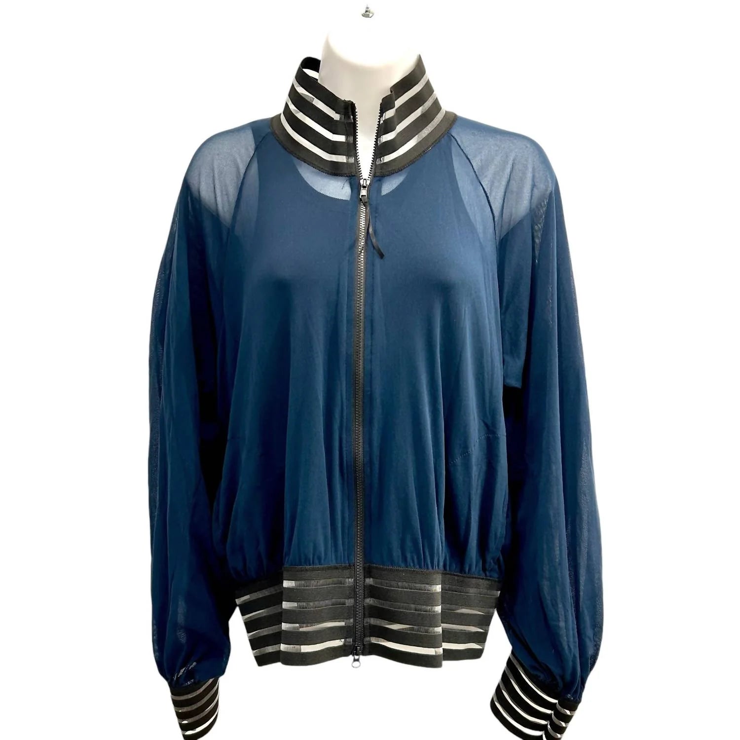 Experience the perfect summer piece with the Women's Mesh Bomber Jacket by Petit Pois By Viviana G, available in navy. Featuring long sleeves and crafted from 100% nylon mesh, this lightweight jacket combines style with comfort through its striped elastic hem and cuffs.