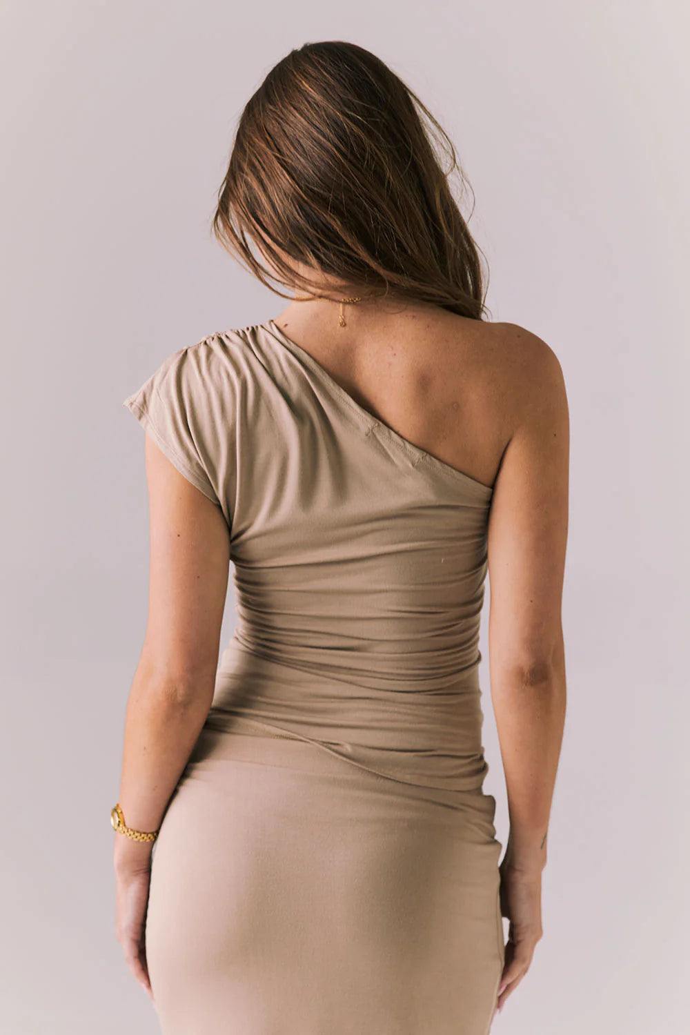 This effortless one shoulder Iced Coffee top features asymmetrical design and fluttering shoulder detailing, inspired by Grecian muses.