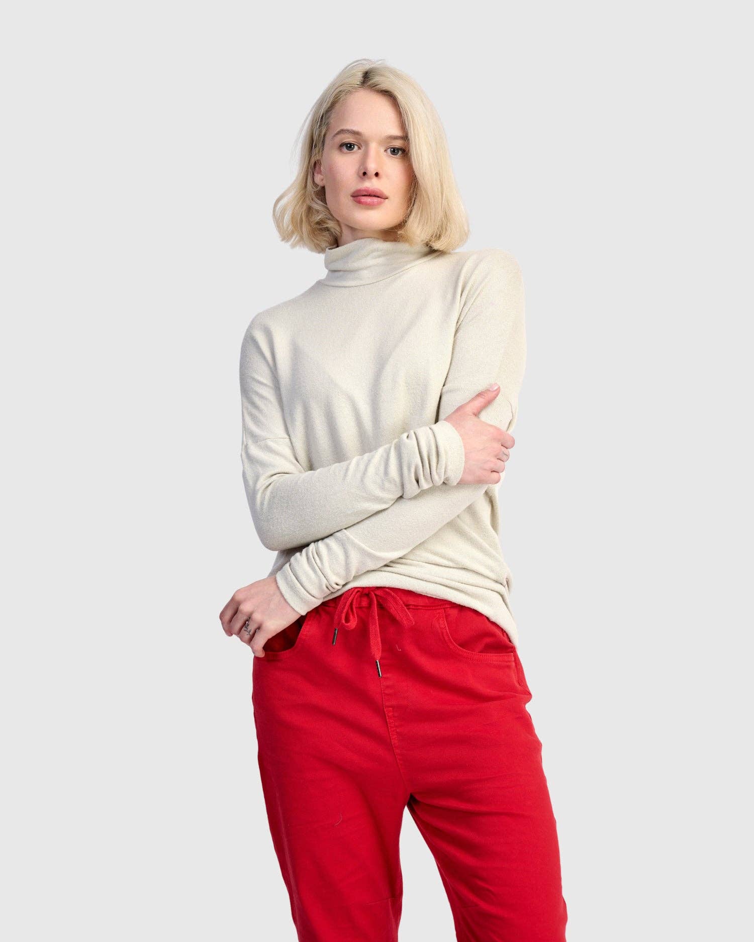 This cream turtleneck is a seasonless layer in soft, stretchy knit. Shaped with a slim body and relaxed shoulders, it flatters with a tapering hem and narrow sleeves. Designed for tucking, scrunching or wearing loose, it's an effortless essential in any wardrobe rotation.