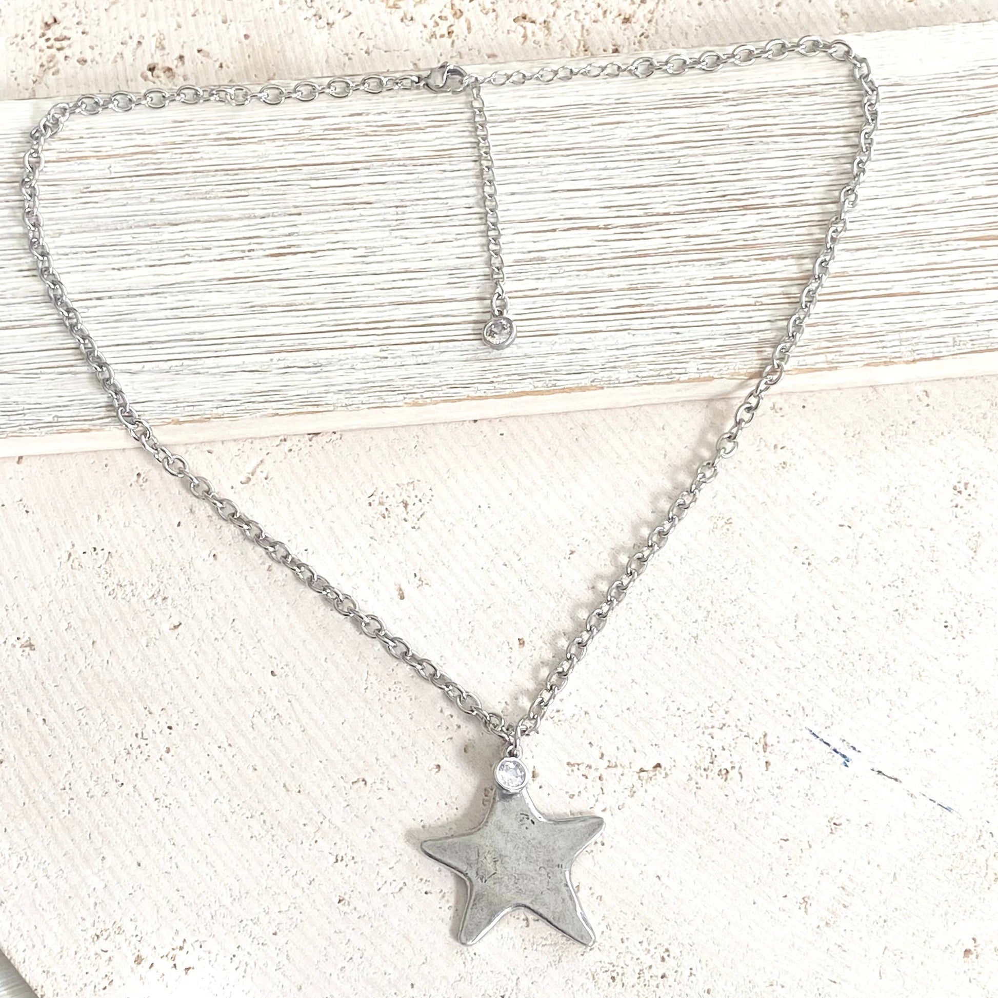 These star necklaces are fun to wear and edgy Glam. They are hand casted, and approximately 32”there is a cute dangling clear 6mm crystal charm. The chain is adjustable up to 17-20 inches. It is a non-tarnishing stainless steel. Choose your color