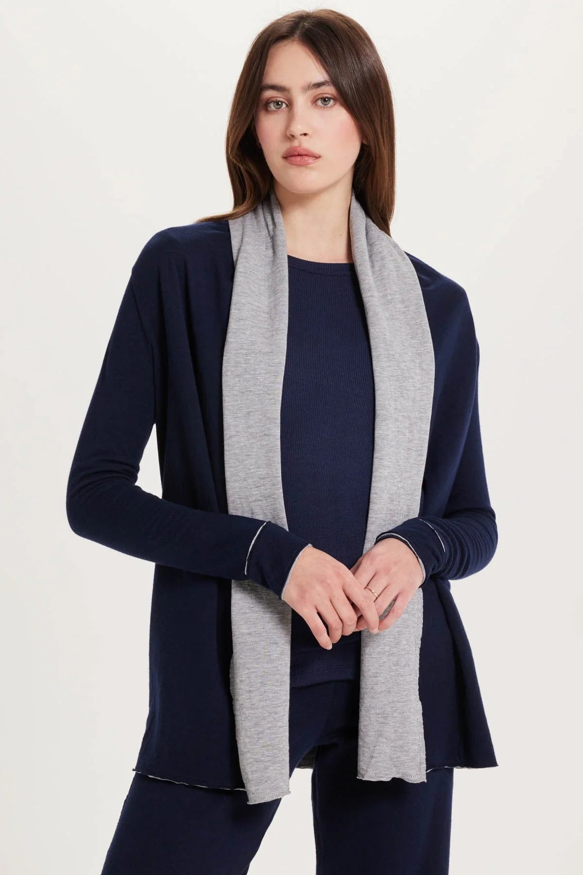 Luxurious ritual: slip into this relaxed, cozy cardigan whenever you need a layer of warmth. Showcasing contrasting inner fabric, this piece paints a rich neutral picture.