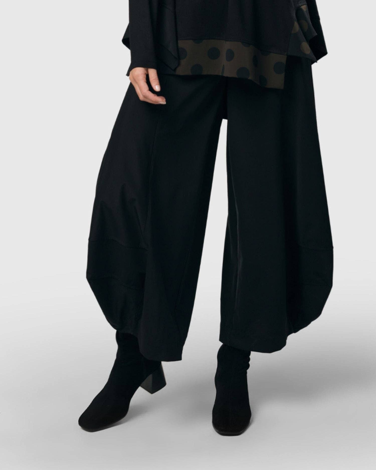 A chic khaki stripe adds interest to the sides and back of our beloved Punto. Rendered in Alembika's exclusive stretch TECHNO fabric, these beautiful pants drape beautifully, don't cling, wrinkle or pill, and keep it up, wash after wash. Smooth all-around elasticized waist, full leg and tapered, signature pouf hem. PS: They are solid black in front.