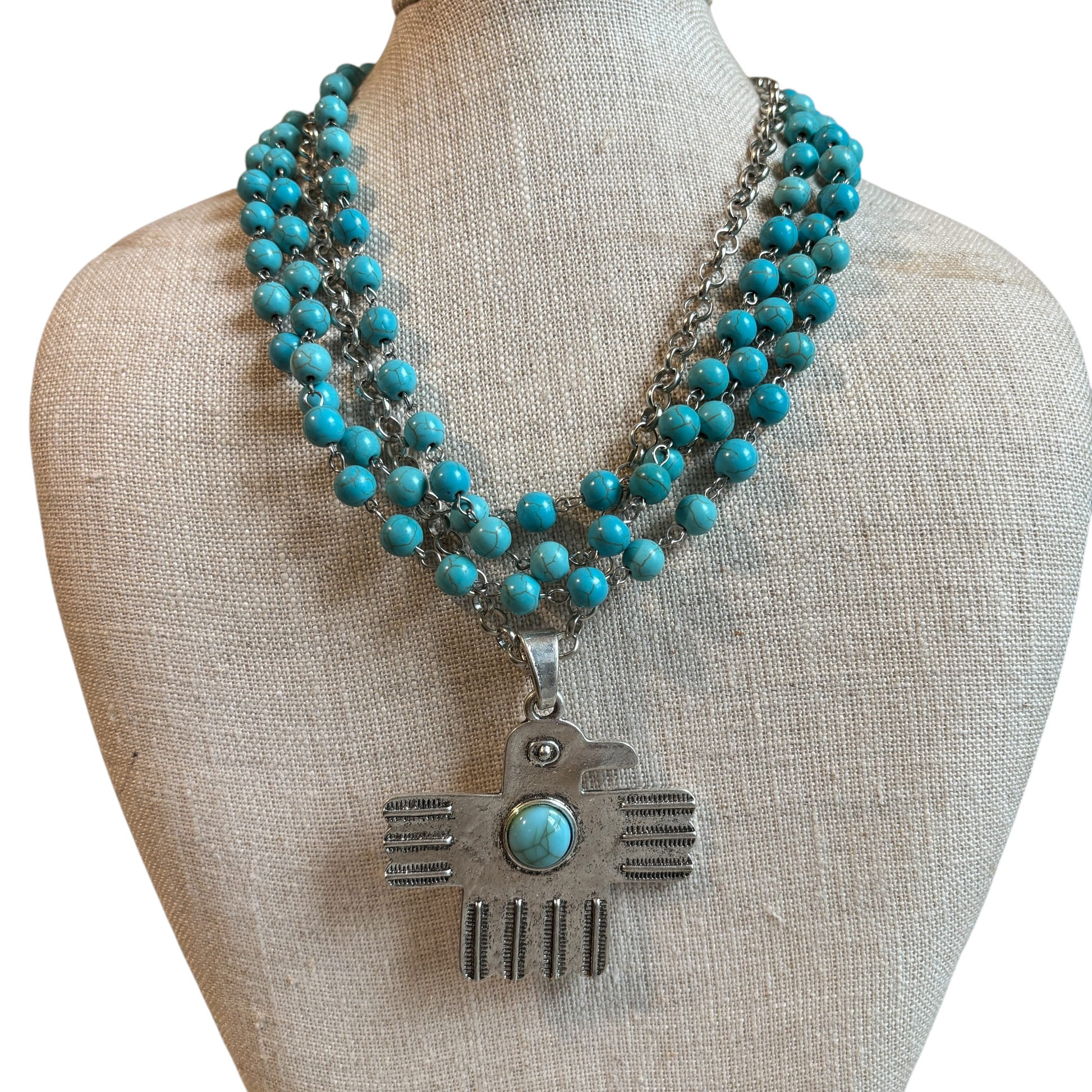 This Turquoise Layered Necklace features 8mm beads accented with a striking Thunderbird motif and durable silver hardware. Its layered design adds depth and sophistication, making it a versatile accessory that complements both casual and formal attire. Crafted for those who appreciate expert craftsmanship and meaningful symbolism, this necklace offers a unique blend of style and cultural significance.
