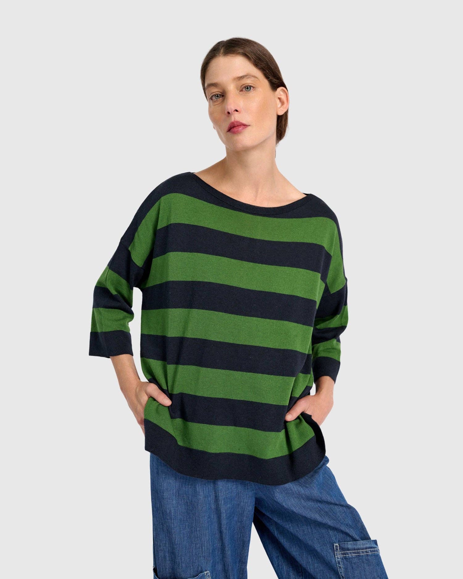 A minimalist staple with subtle flair, the Twiggy Sweater is crafted from a smooth striped cotton blend that drapes with ease. Its boxy cut and hip-length hem offer a modern shape, while bracelet sleeves and a boat neckline lend casual sophistication. Ideal for transitional weather, it layers effortlessly over slim trousers or flowy skirts.