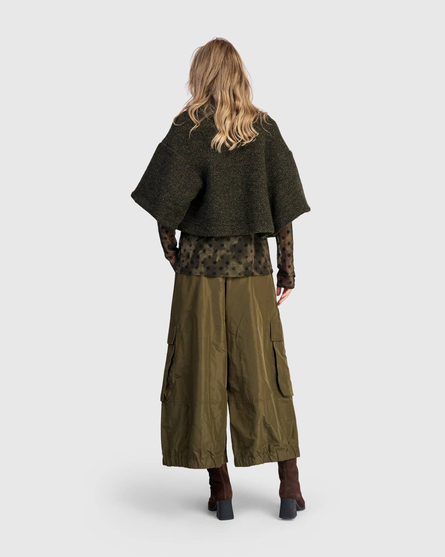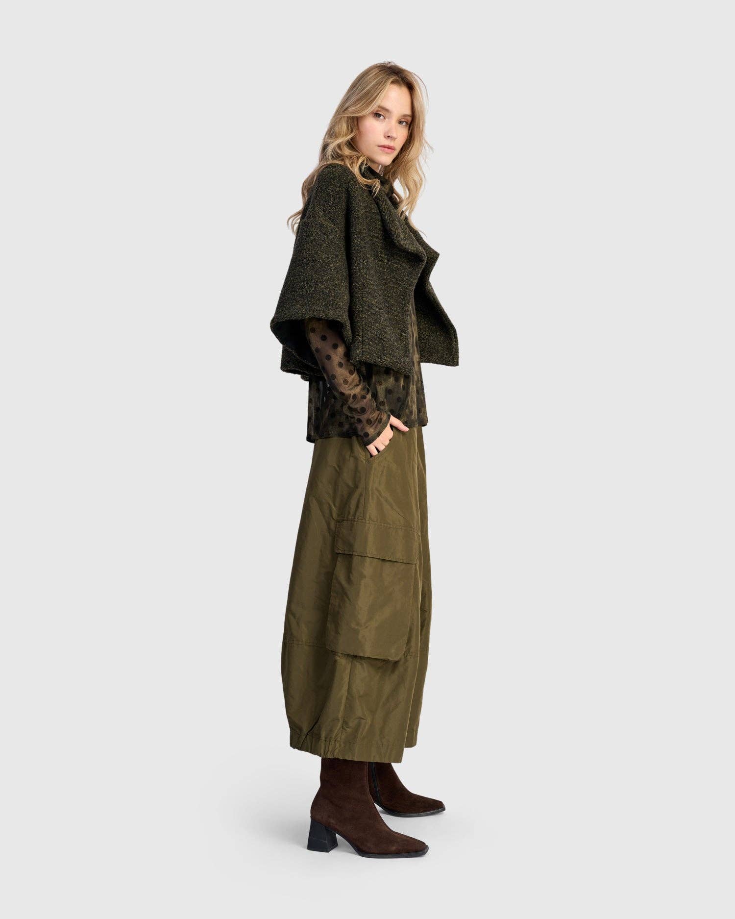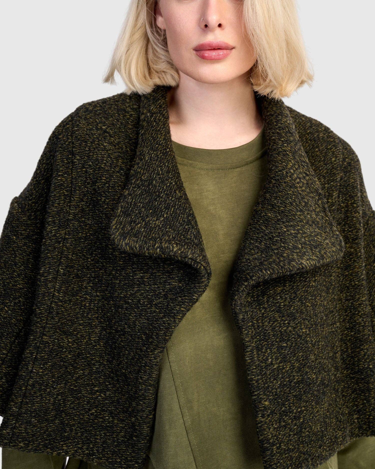 This softly structured crop jacket has effortless appeal, styled with generous sleeves and a draped open front. Its A-line cut and brushed knit finish make it both cozy and elegant. The khaki tone adds versatility, pairing easily with tonal layers or prints across the Urban collection.