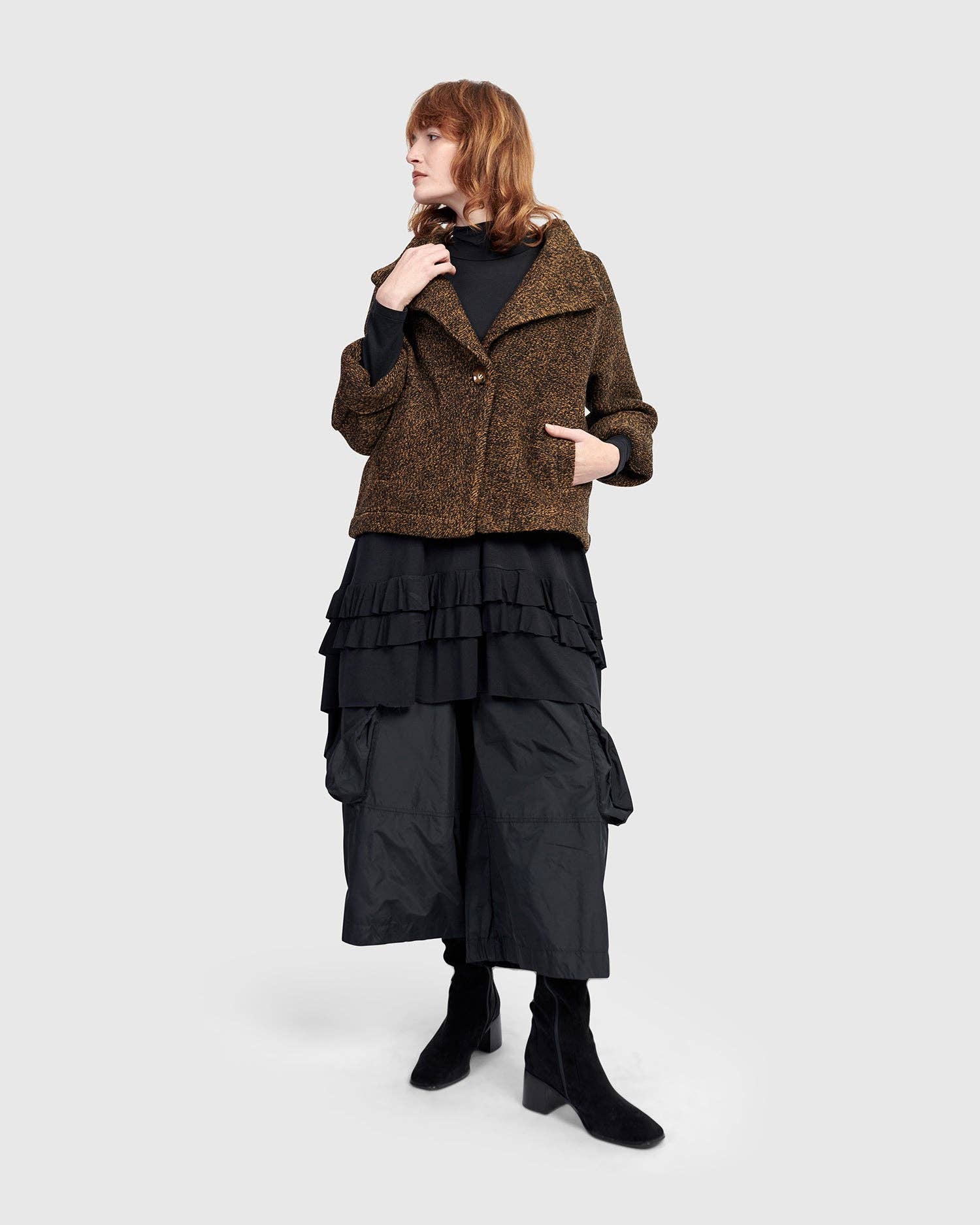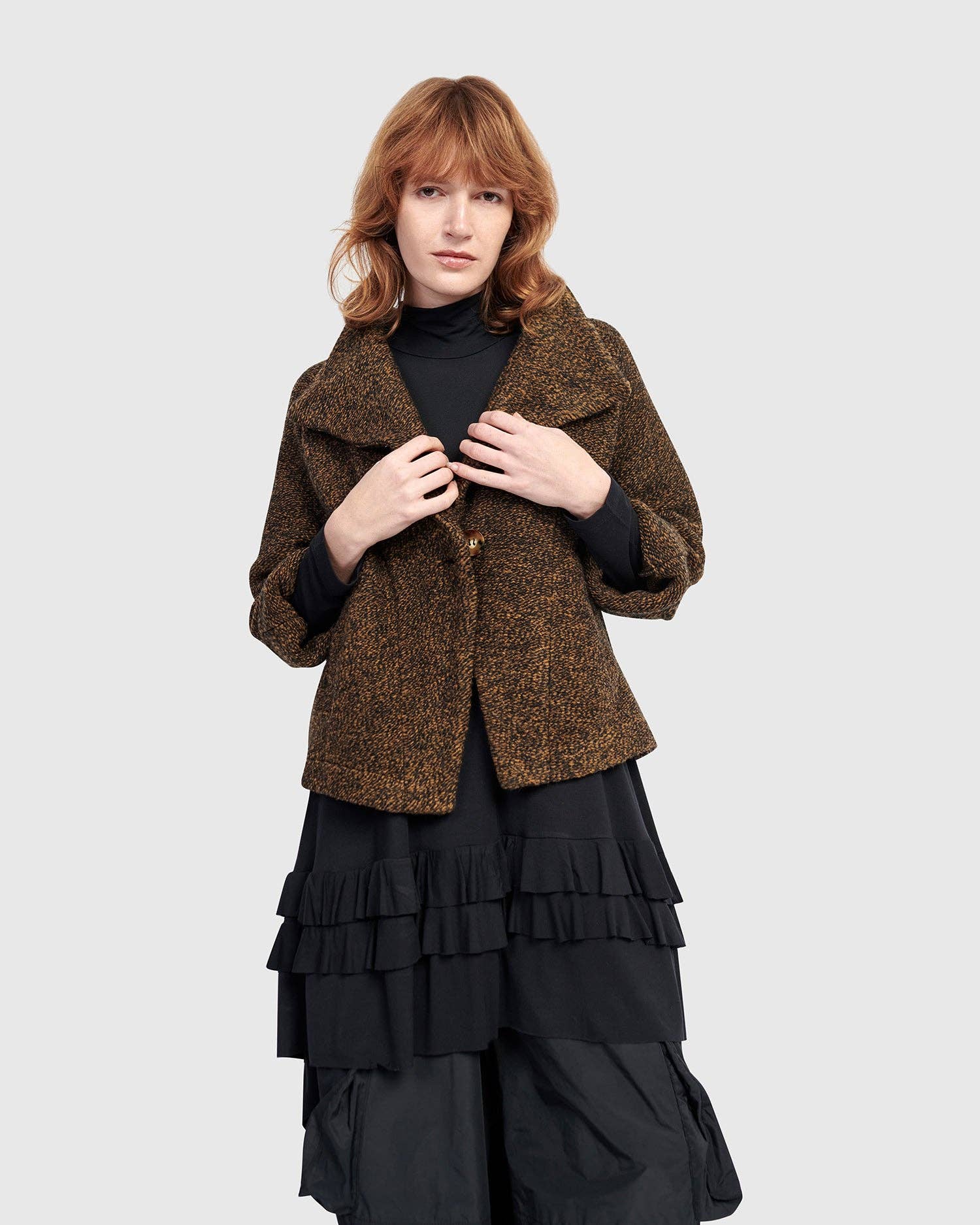 Effortlessly modern, this cropped jacket combines soft structure with smart design. The brushed knit fabric lends cozy texture, while a boxy A-line shape and raglan sleeves enhance its relaxed appeal. Oversized lapels and a single button closure elevate the finish. Layer it over dresses, knits, or trousers for an easy-chic statement.