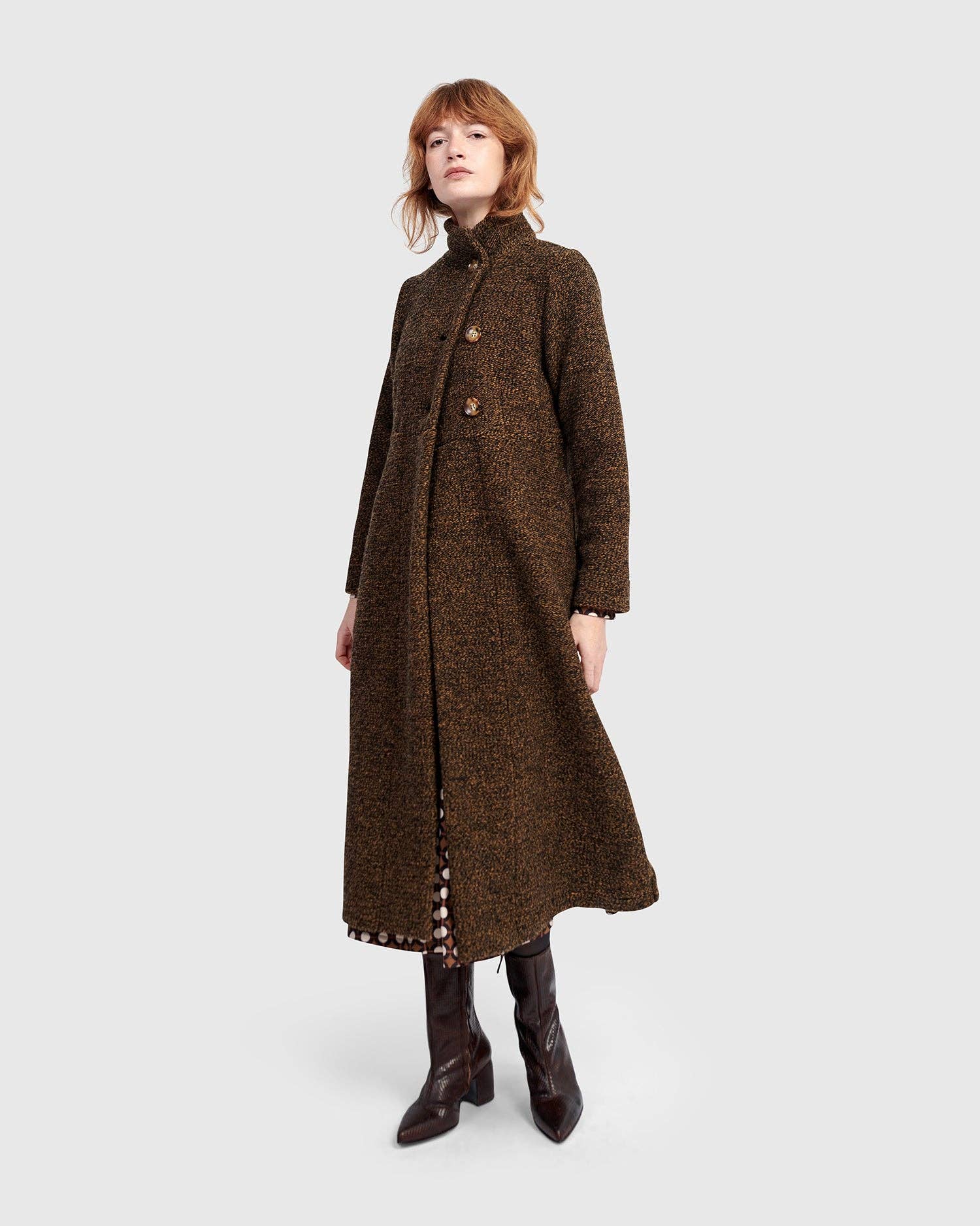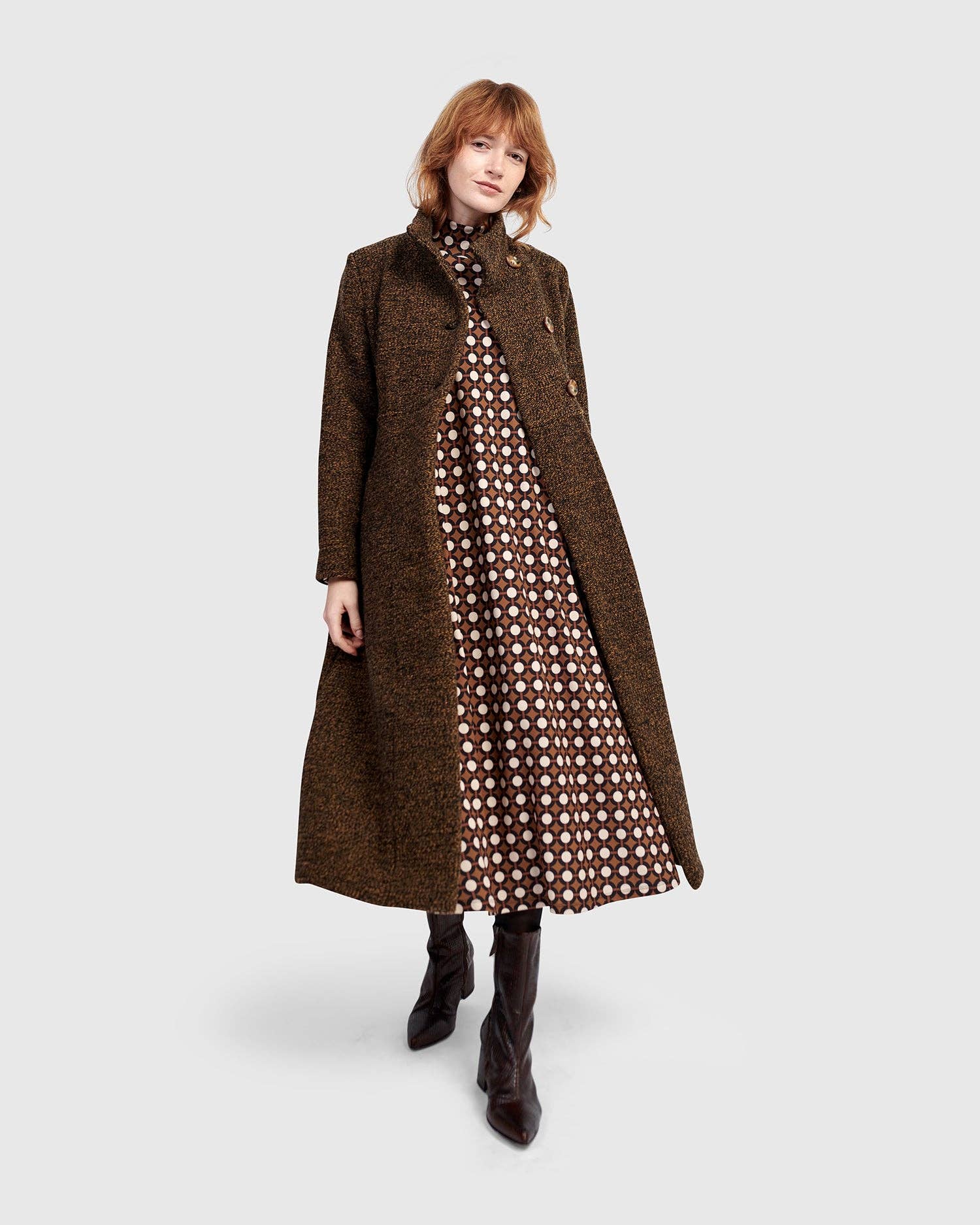 The Urban Tash Coat blends timeless tailoring with cozy comfort. It features a gently flared silhouette that flatters a range of shapes, while the foldable high collar and mid-calf length offer added coverage. Crafted in a rich wool blend knit with a soft brushed finish, this versatile coat moves seamlessly from day to night.