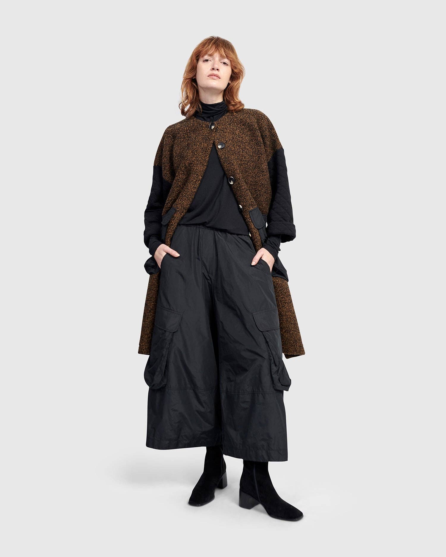 These high-waisted cargo pants strike the balance between structure and ease. Cut from swishy taffeta, they feature a wide A-line leg, cropped hem, and generous pocketing that adds function and flair. With a flat elastic waist and clean mock fly, they deliver elevated utility with pull-on comfort.