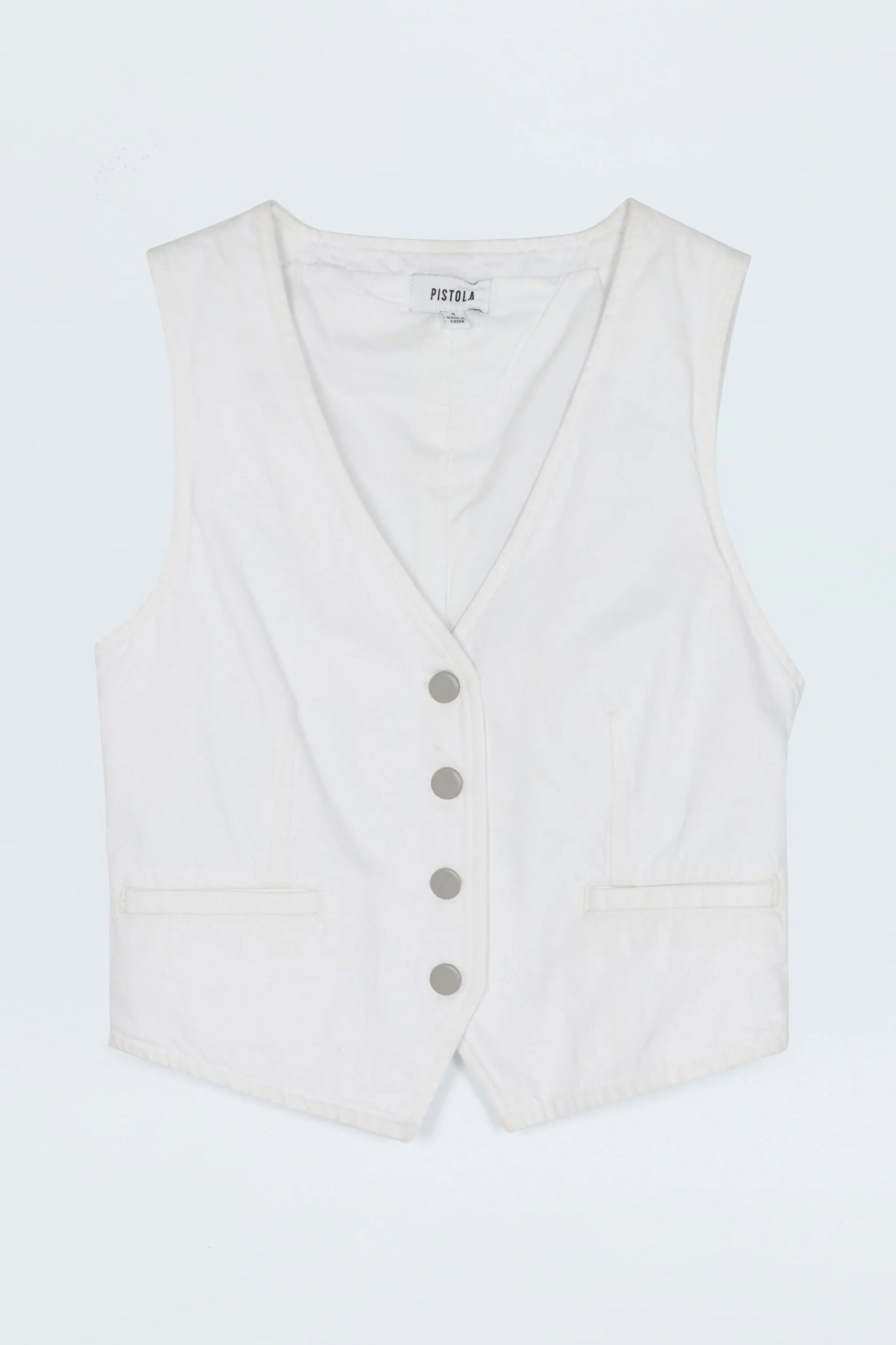 Versatile Style, Effortless Chic. This fitted denim vest is a must-have for any fashion-forward wardrobe. The flattering silhouette and cropped length create a sleek look, while the white hue pairs perfectly with everything. Dress it up or down – the styling options are endless.
