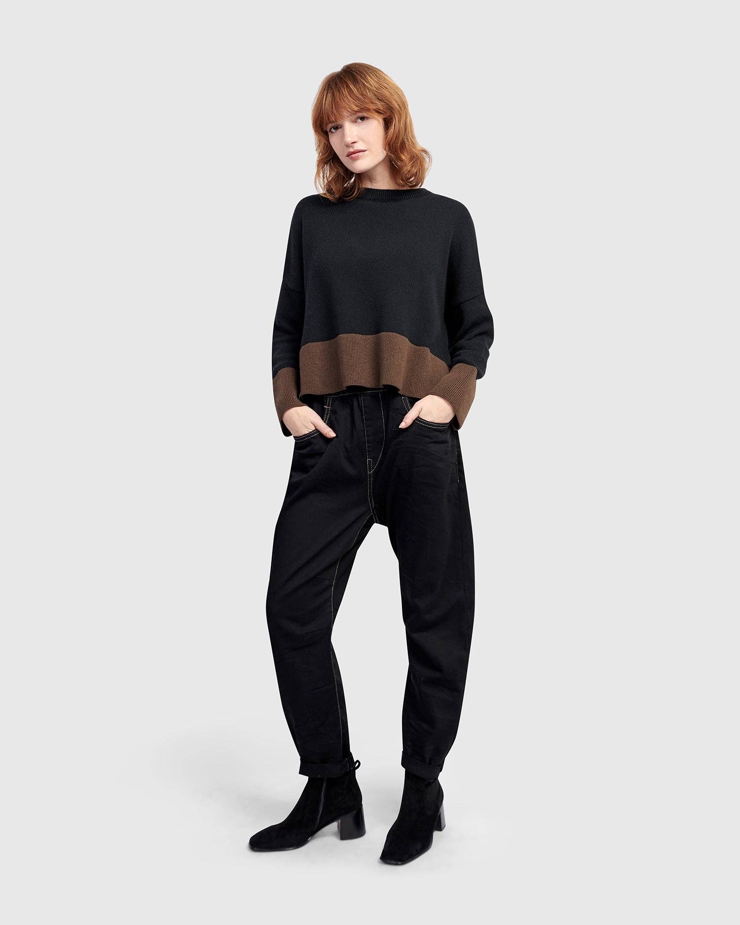 Colorblock composition and a cropped cut give this sweater graphic charm. The flat knit lends it a sleek feel, while drop shoulders and a boxy shape keep it effortless. Pair it with wide-leg pants or jeans for bold balance.